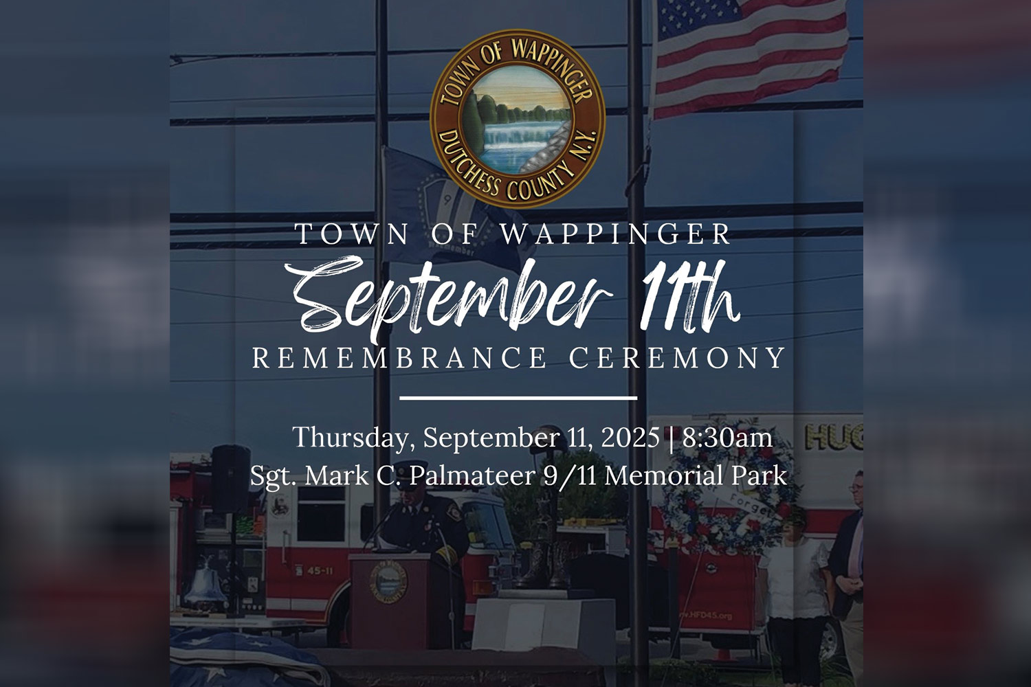 Wappinger, NY – The Town of Wappinger will recognize the Anniversary of 9/11 by conducting the annual September 11th Remembrance Ceremony on Thursday, September 11th at 8:30am at the Sergeant Mark C. Palmateer 9/11 Memorial Park, located on the corner of Route 9, Old Hopewell Road and Sgt. Palmateer Way.